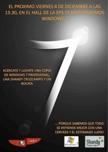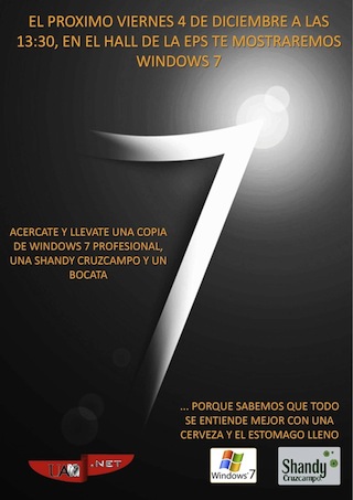 Este viernes, a las 13:00, con una cerveza y un bocata, ven a por tu copia de Windows 7 si eres estudiante, profesor, o formas parte del PAS de la Autónoma de Madrid, será en el hall de la EPS (la que está al lado de la biblioteca de ciencias, lejos de todo…) y está organizado por el dotnetClub de la UAM en colaboración con Microsoft España, cuyo apoyo a los estudiantes me ha sorprendido gratamente.