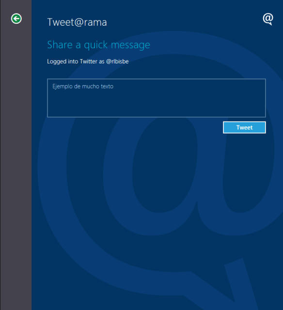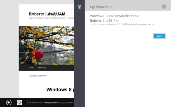 Finalmente, ejecutamos nuestra aplicación y probamos a compartir con otra (por ejemplo Tweet@rama que viene incluida con Windows Developer Preview):