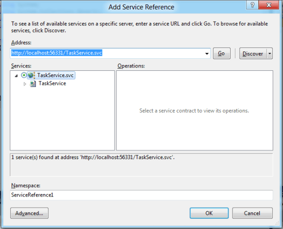 Para consumir el servicio se ha de agregar una referencia al proyecto, haciendo click derecho en el proyecto y seleccionando la opción «Agregar referencia de servicio«. En la ventana que surgirá, al hacer en el botón «Discover» se mostrará una referencia a todos los proyectos de tipo servicio web que se hayan creado recientemente como se muestra en la imagen: