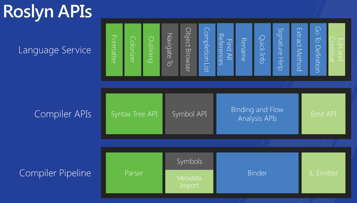 Lo que hace a Roslyn una herramienta tan especial, es que cada una de las fases que se han comentado antes tendrá una API específica, con lo cual nos encontraremos con varias API diferentes para las siguientes fases: