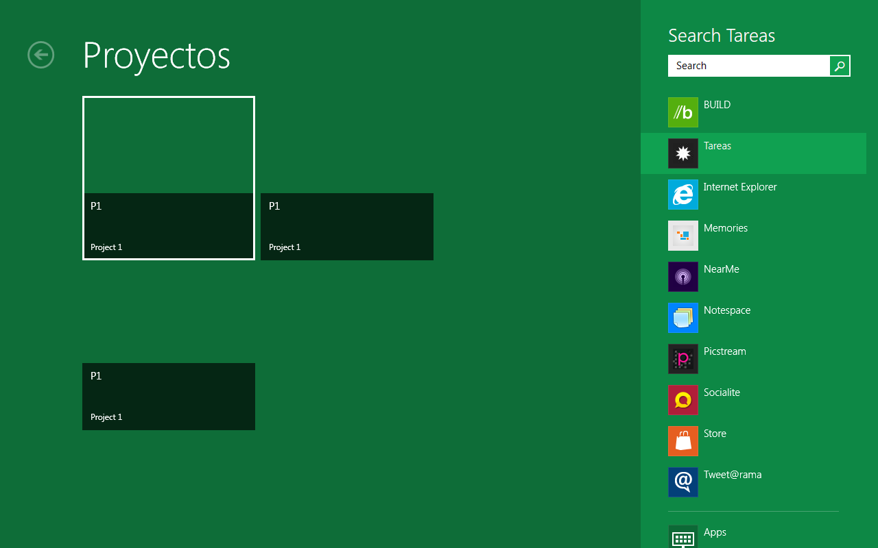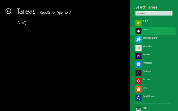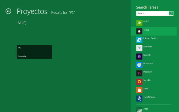 Tras agregarlo, se puede compilar el proyecto y ejecutarlo, para comprobar que se ejecuta correctamente, si carga el charm de búsqueda desde cualquier punto de la apliacación, o desde cualquier otro punto de la interfaz metro, lo que se mostrará será la siguiente imagen: