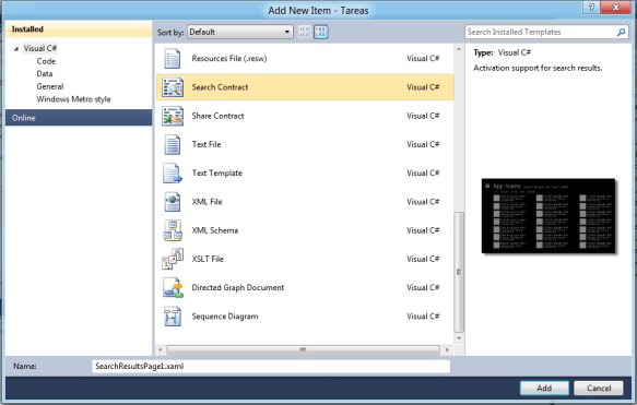 Para agregar el contrato de búsqueda, el proceso es el mismo que con el otros contratos, en un proyecto existente, se hace click derecho en el icono del proyecto, a continuación en Add new item… Posteriormente se selecciona Search Contract y se agrega a la solución.