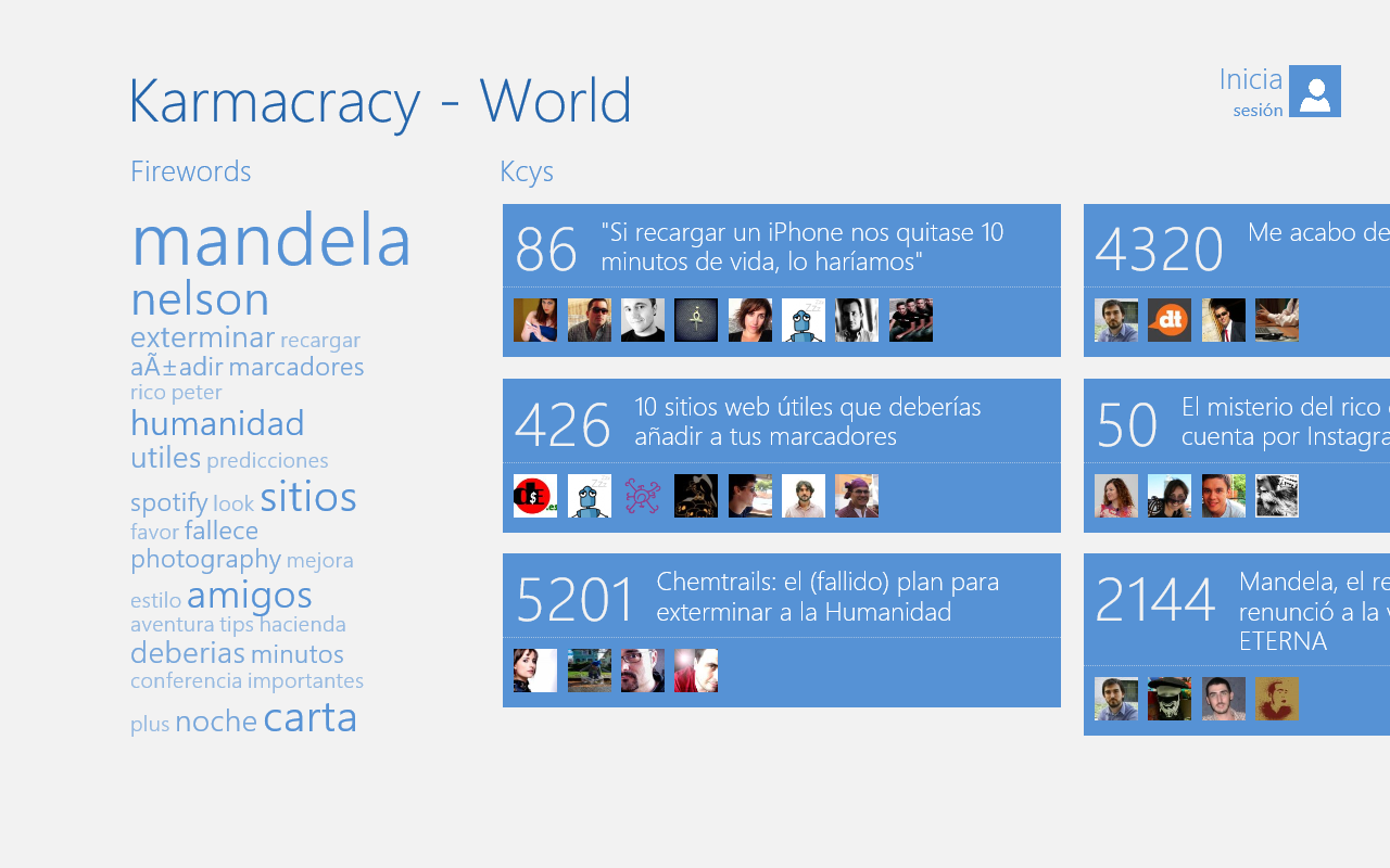 En estos días he empleado algo de mi tiempo libre desarrollando una aplicación para Windows 8 usando la API de Karmacracy para la cual he intentado usar al mínimo WinJS y los controles por defecto, manteniendo, además, el diseño anteriormente conocido como «Metro». El resultado hasta ahora es este, aunque está sujeto a cambios, y a mejoras: