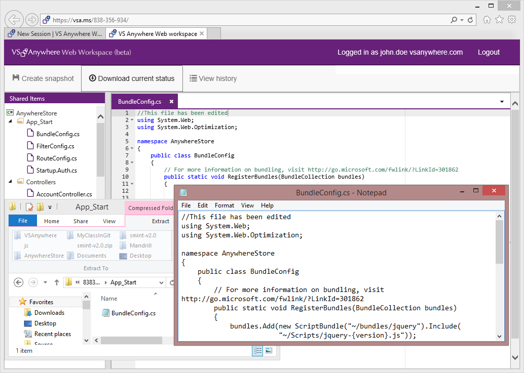 De la misma manera que podemos crear un snapshot, también podemos descargar el estado actual del proyecto, para integrarlo en nuestro workspace de git o TFS local, descargando un fichero que contiene solamente los documentos abiertos y los editados, siendo el resultado el que se muestra: