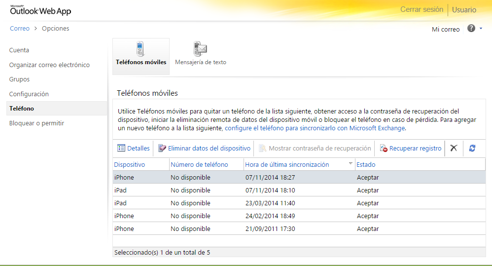 Un error que podemos tener cuando configuramos un nuevo dispositivo con Exchange es que, sin tener ningún error ni señal de fallo, no recibamos ningún e-mail. La solución pasa por acceder a nuestro Outlook Web Access y comprobar el número de dispositivos conectados.