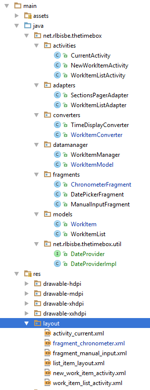 La aplicación cuenta con tres vistas (actividades como se denominan en Android), un controlador de tabs, dos fragmentos personalizados y varias clases auxiliares para el manejo de los datos.
