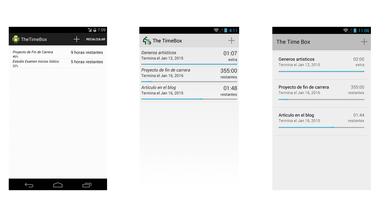 The Time Box es una mezcla entre lista de tareas y cronómetro, con opción de poder agregar manualmente las horas y minutos transcurridos de la actividad deseadas. Este es el aspecto que ha tenido desde la primera vez que tuve algo «depurable» hasta la versión actualmente disponible en la tienda: