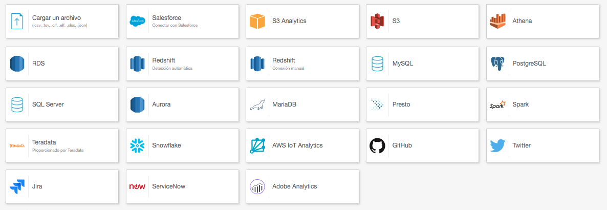 Todo en QuickSight empieza por el conjunto de datos. Un conjunto de datos no deja de ser una información tabulada que analizaremos posteriormente, que puede ir desde ficheros separados por comas, bases de datos relacionales, o fuentes de datos utilizando APIs como Twitter, como podemos ver a continuación en el menú de Administrar datos -> Nuevo conjunto de datos: