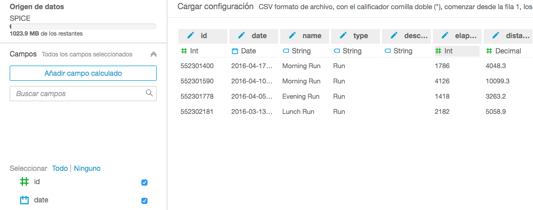 Una vez subimos nuestro fichero separado por comas a QuickSight, veremos la pantalla de edición de nuestro conjunto de datos: