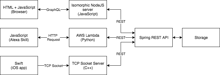 Llegados a este punto, nos encontramos en una posición en el que los clientes (la aplicación móvil, la aplicación principal, la skill de alexa y un desarrollador independiente) dependen de una API común o de una serie de APIs independientes, con lo cual se genera un acoplamiento fuerte entre dos o más sistemas.